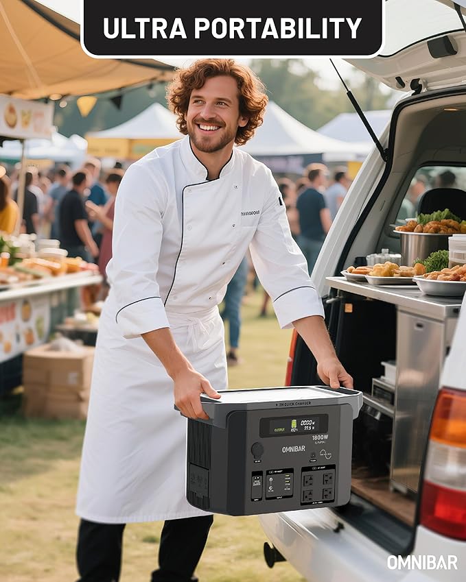 - 10-Year Long-Lasting LiFePO4 Battery: The Omnibar Portable Power Station 1800W is equipped with advanced LiFePO4 (LFP) battery cells, offering over 3,000 full charge cycles for outstanding lifespan, stability, and safety. Built for long-term, reliable, and eco-friendly power, it's an ideal choice for outdoor adventures, RV travel, home backup, and emergency use.