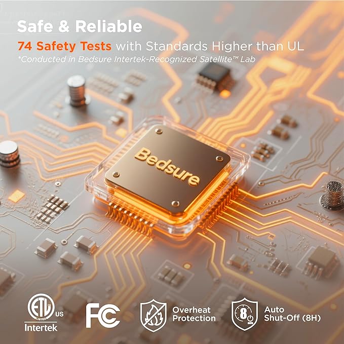 - Safer & More Reliable: Conducted in Bedsure Intertek-Recognized Satellite Lab, 74 safety tests with standards surpassing UL ensure safer performance. This electric blanket queen is ETL and FCC certified, and its default 8-hour auto shut-off prevents it from overheating so that you can enjoy warmth with complete peace of mind