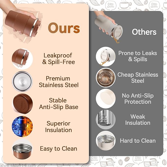 - Superior Thermal Insulation: Featuring advanced double-wall vacuum insulation, this travel mug effectively preserves the temperature of your beverage without causing heat transfer or condensation on the outer surface. Whether you're enjoying a hot brew or a cold refreshment, your drink stays enjoyable from the first sip to the last.