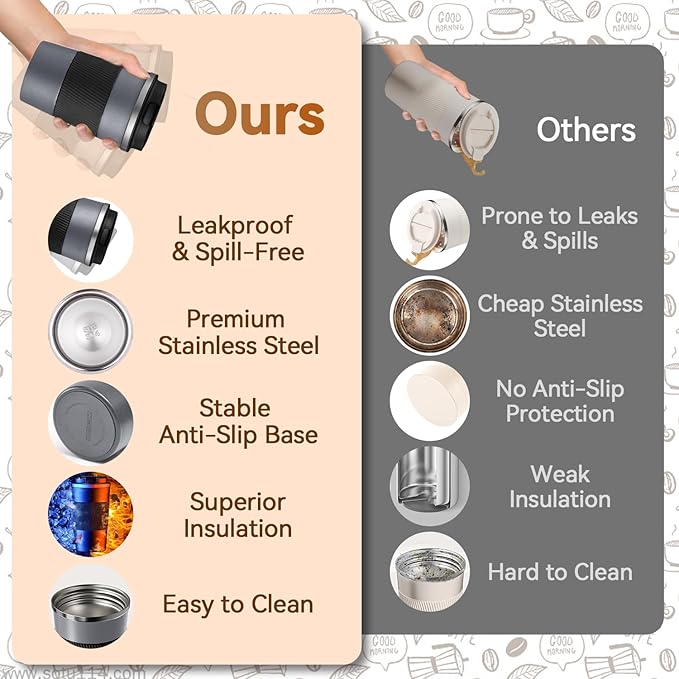 - Superior Thermal Insulation: Featuring advanced double-wall vacuum insulation, this travel mug effectively preserves the temperature of your beverage without causing heat transfer or condensation on the outer surface. Whether you're enjoying a hot brew or a cold refreshment, your drink stays enjoyable from the first sip to the last.