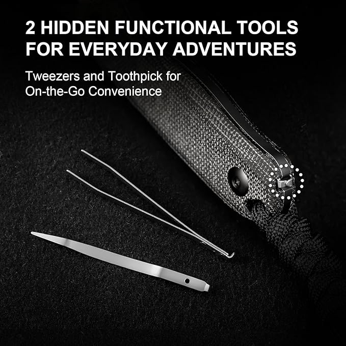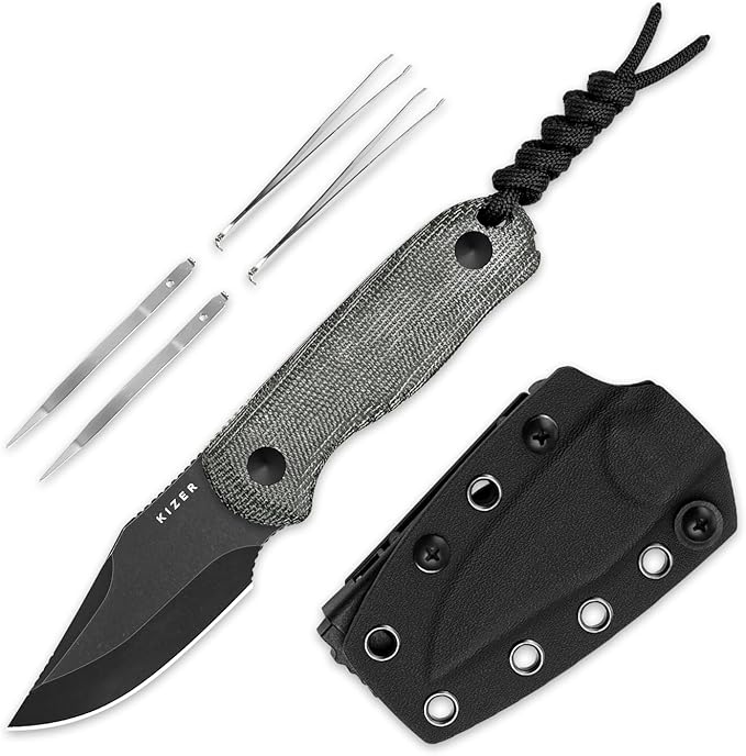 - EDC Camping Fixed Blade Knife with Hidden Tweezers & Toothpick: Kizer drop bear edc pocket fixed blade knife with sheath features a black micarta handle with a non-slip texture for a secure grip in any condition; It includes two sets of tweezers and toothpicks, with one set cleverly concealed in a hidden slot until needed—perfect for removing splinters, prepping food, or handling small tasks