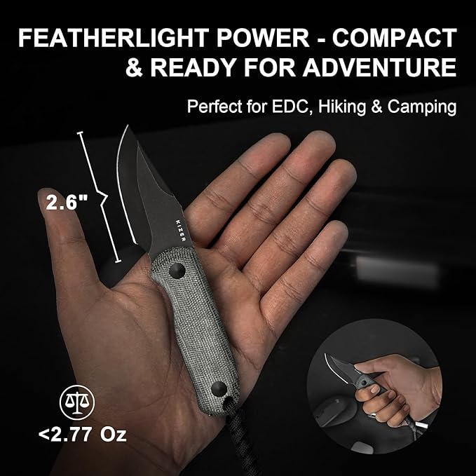 - Lightweight & Compact Design: Featuring a 2.6-inch blade and weighing under 2.77 oz, this Kizer drop bear fixed blade knife with kydex sheath is perfect for everyday carry; Durable enough for outdoor activities like hiking, camping, or hunting, it offers the ideal balance of portability and toughness