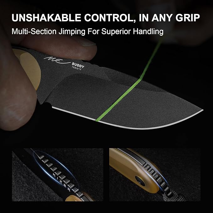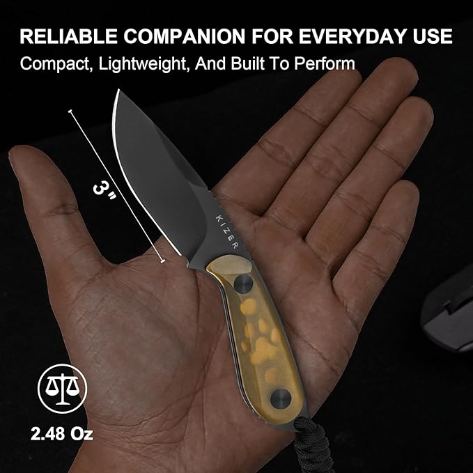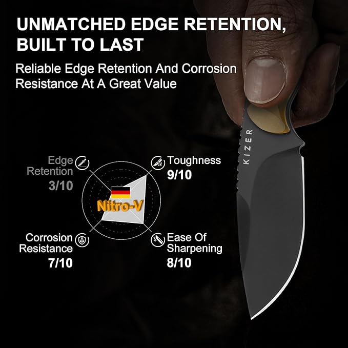 - Handy Stylish Fixed Blade Knife for Daily Tasks: The Kizer fixed blade knife is made from Nitro-V steel, offering exceptional sharpness and durability. Coated with a Matte Black Titanium PVD finish, it enhances corrosion resistance and hardness, making the hunting knife highly wear-resistant. Its balanced carbon and nitrogen content ensures toughness and ease of sharpening, while its affordability makes it accessible to a wide range of users.