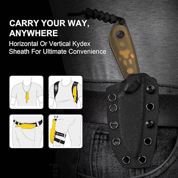 - Kydex Sheath: The camping knife comes with an adjustable Kydex sheath that offers horizontal or vertical carry options. Its compact design allows easy carry on a belt, in a bag, or any preferred way, keeping the fixed blade pocket knife within reach for various tasks. Whether for outdoor adventures or daily use, the fixed blade with sheath ensures you're always prepared, providing both practicality and reliability.