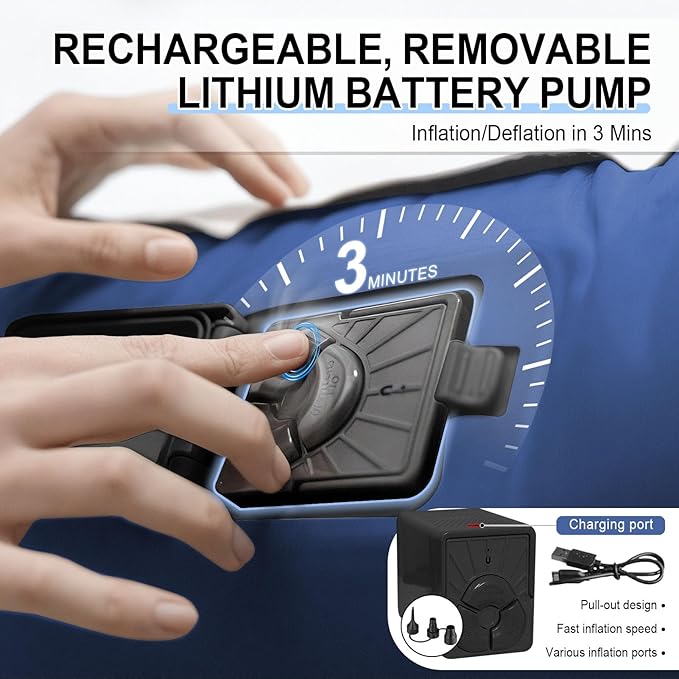 - 3-Minute Fast Inflation with Dual-Power Option:Features a built-in 1300mAh lithium battery pump (USB-C rechargeable) for cordless inflation in just 3 minutes, plus an included power cord for outlet use. The LED display clearly shows the power mode.A single charge supports multiple full inflations and deflations, making it perfect for outdoor adventures or quick indoor setup.