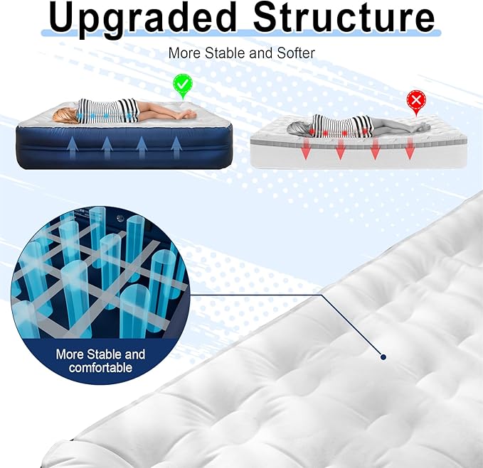 - Exclusive Patent-Pending Support Structure – Holds Up to 750lbs:Engineered with a unique horizontal and vertical webbing design and a multi-layer "hamburger" construction, this air mattress evenly distributes weight and eliminates sagging or motion transfer. With a 750lb weight capacity and reinforced edges for enhanced lumbar support, two adults can sleep soundly without rolling toward the center.