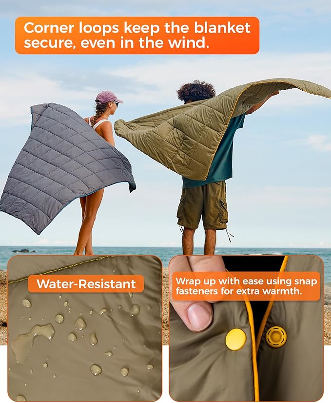 - WEARABLE, HANDS-FREE DESIGN & EXTRA-LARGE COVERAGE FOR TWO: With snap buttons for easy transformation, this puffy camping blanket can be worn like a shawl or cape, keeping your hands free for walking around the campsite, watching outdoor sports, or relaxing by the fire.