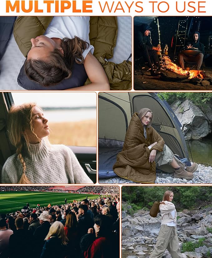 - LIGHTWEIGHT & PORTABLE WARMTH ON-THE-GO: This camping blanket unfolds to 69"L x 53"W and weighs just 1.32 lbs—lighter than a water bottle, giving you generous coverage without the bulk. It packs down to a compact 13.8" x 9.5" x 5.9" in the included stuff sack, making it easy to carry on hikes, backpacking trips, road adventures, or travel.