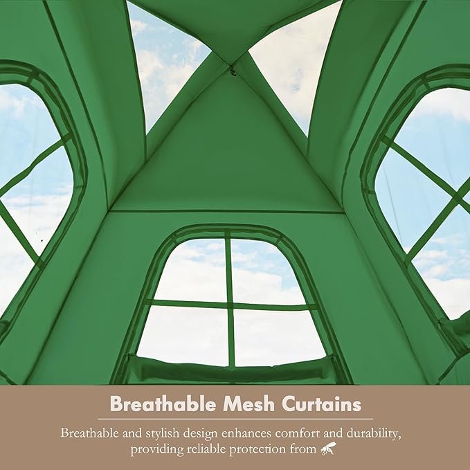 - 【Excellent Ventilation】This inflatable camping tent has mesh vents on the top and a removable top cloth. Whether it is raining or sunny, the inside of the tent can be well ventilated. The design of three-sided mesh and one door increases air circulation while protecting privacy, keeping you cool and comfortable on hot summer days