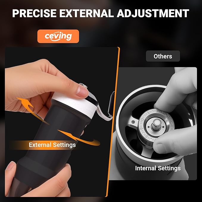 - 40 EXTERNAL ADJUSTABLE GRIND SETTINGS – Unlike traditional grinders with hidden internal adjustments, our manual coffee mill features 40 precise external settings for effortless fine-tuning. Simply turn the dial to switch from espresso-fine to French press-coarse—no guesswork, no messy spills. Enjoy full control over your grind for richer flavor in every cup!