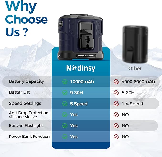 - ๐๐๐จ๐ง๐ -๐ฅ๐๐ฌ๐ญ๐ข๐ง๐ ๐๐ฌ๐ ๐๐ข๐ฆ๐: The Nodinsy Hanging Waist Fan is equipped with a robust 10,000mAh battery, enabling up to 30 hours of continuous operation. Impressively, despite its remarkable endurance, the portable fan rechargeable takes merely 5 hours to reach a full charge. This means you can quickly get back to enjoying all - day coolness without enduring extended waiting times, striking the perfect balance between long-lasting performance and convenient recharging.
