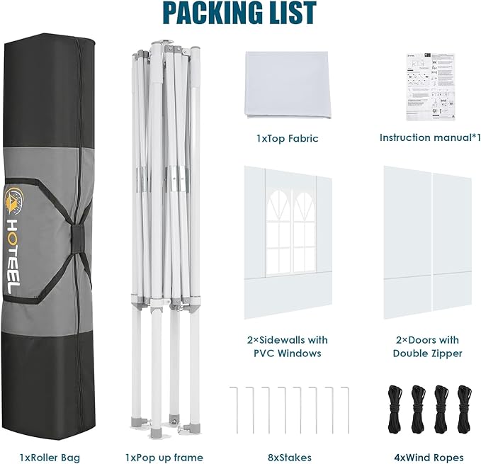 - 🏆【Packing list & After-sale Protection】Pop Up Canopy Frame×1,6.6x6.6 Canopy Top Cover×1,Silver-coated Panels×4 (2xWindows and 2xDoors with Zipper), Ground Nails×8, Wind Ropes×4, Portable Bag×1, Manual×1. We provide warranty service, if you have any questions with Hoteel pop up tent 6.6×6.6, please feel free to contact us. We will solve it for you immediately.