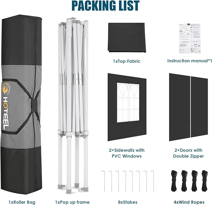 - 🏆【Packing list & After-sale Protection】Pop Up Canopy Frame×1,6.6x6.6 Canopy Top Cover×1,Silver-coated Panels×4 (2xWindows and 2xDoors with Zipper), Ground Nails×8, Wind Ropes×4, Portable Bag×1, Manual×1. We provide warranty service, if you have any questions with Hoteel pop up tent 6.6×6.6, please feel free to contact us. We will solve it for you immediately.