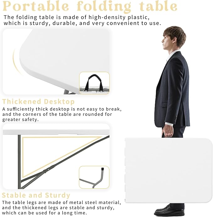 - Multi Functional Outdoor Table:The surface of this folding table is smooth and sturdy, easy to wipe, and the table corners are designed with rounded corners for safety and reliability. The anti slip covers on the four table legs prevent the table from shaking freely and protect the floor from scratches. Each table can accommodate 4-8 people, making it the best choice for outdoor camping, indoor activities, picnics, offices, birthday parties, banquets, weddings, craft fairs, kitchen table, and other events.