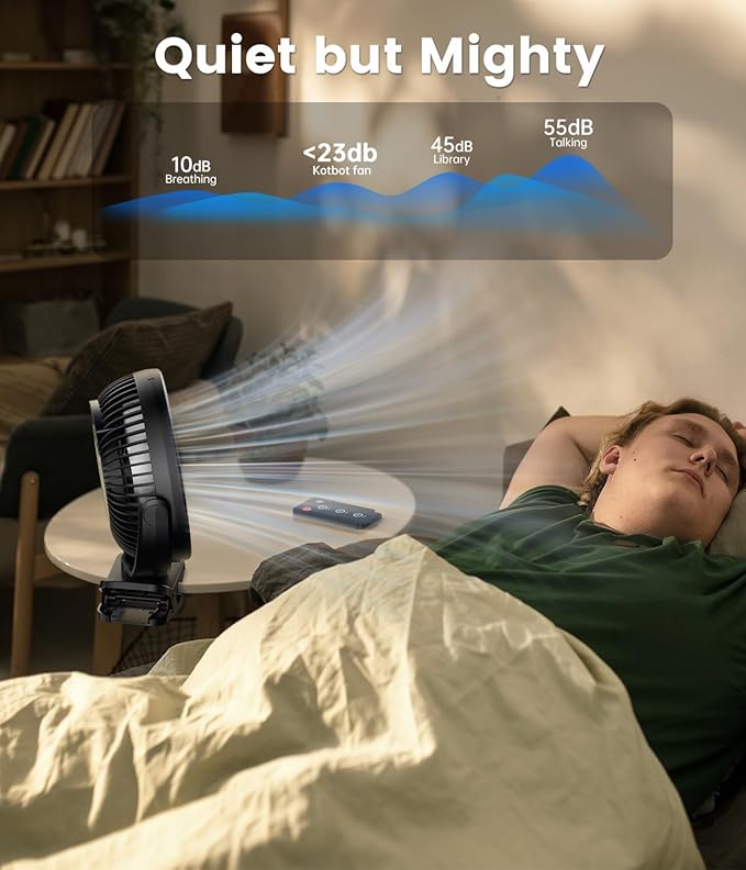 - MIghty but Ultra Quiet - This rechargeable fan is super quiet and able to blow out super strong airflow with 8-in blades and operational noise <23db while sleeping. Our clip fan has 3 adjustable speeds, one button to the most comfortable wind speed. Compact size allows you to place it at a corner of your desk, treadmill, golf cart, bed, small space, multiple usages