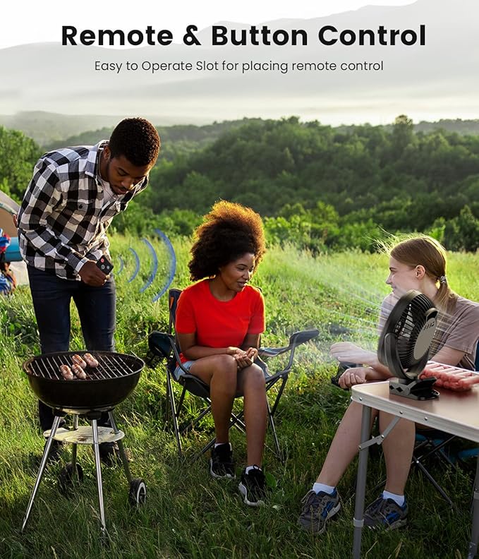 - Bonus Remote & 2 Brightness - Our portable rechargeable fan comes with Wireless Remote Controller max range 15ft, no need to stand or stretch out your arms, so convenient for busy hands. Built-in 9 LED lights with adjustable 2 levels brightness, lighting up in tent or outdoor activities, cooling & safe for hot night