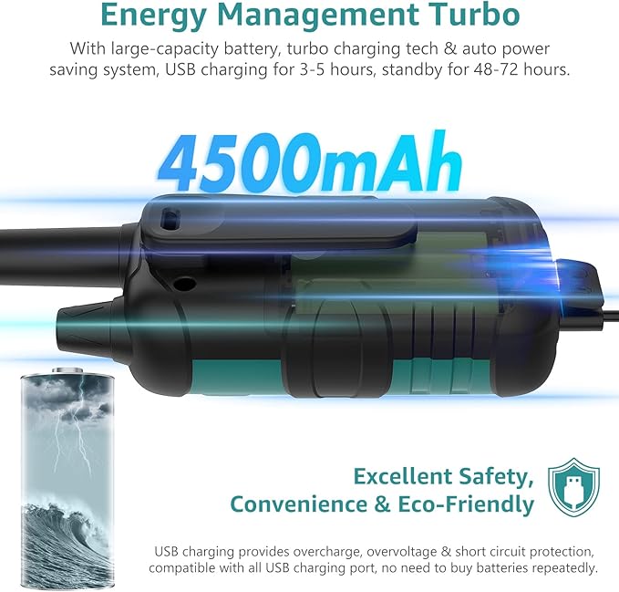 - 【Energy Management Turbo】:Experience the brilliance of a large-capacity battery with turbo charging tech. The 4500mAh rechargeable battery has high safety and long life, no more frequent charges or buying batteries, save the environment and your wallet. Enjoy the convenience of original USB fast charger with 48-72 hours of standby on a mere 3-5 hour charge, USB compatibility ensures you can charge anywhere, anytime, such as charged by car, laptop or power bank, etc