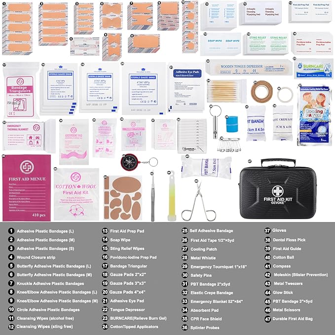 - Perfect For Family Use: The first aid kit includes 410 pieces of high-quality emergency essentials and first aid supplies to help care for minor wounds, cuts, scrapes, burns, sprains, and blisters