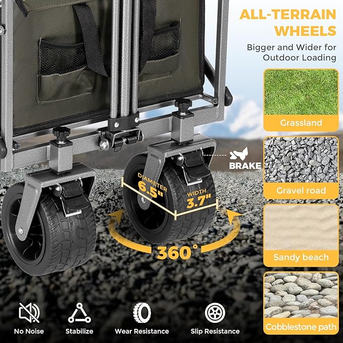 - 【All-Terrain Wheels】: Features 6.5-inch wheels (including two 360° rotating front wheels) with deep treads for effortless rolling over sand, gravel, grass, and uneven terrain—no more struggling with flimsy carts!