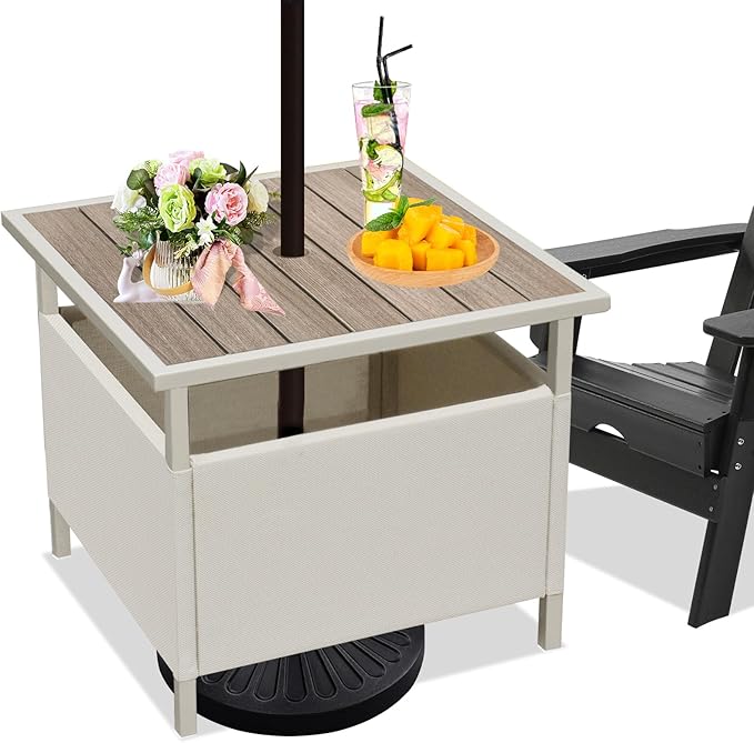 - ALL-WEATHER MATERIAL:LZRS patio umbrella side tables are made of HDPE material. Our material prevents warping, dents, rot, and fading, it perfectly improves the shortcomings of solid wood, which is easy to rot, mold, chip, peel and crack.