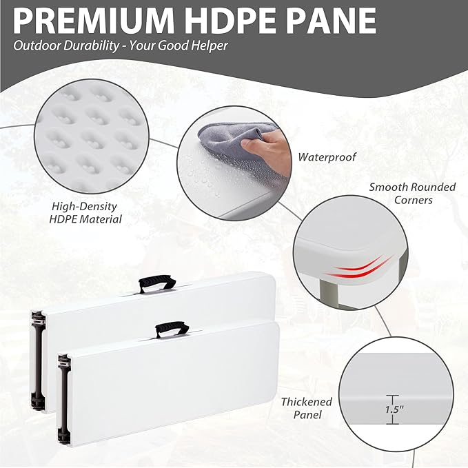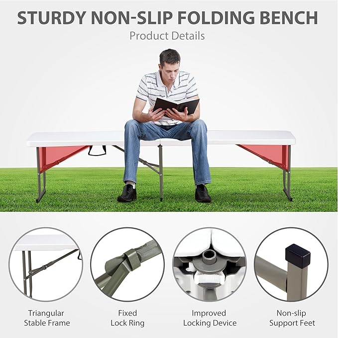- 【 Beautiful & Versatile 】Our folding bench adopts classic white panel, which can be integrated into any scene and has strong aesthetics;It works whether you're hosting a banquet, having an outdoor picnic, camping out, organizing a party, or watching a game.