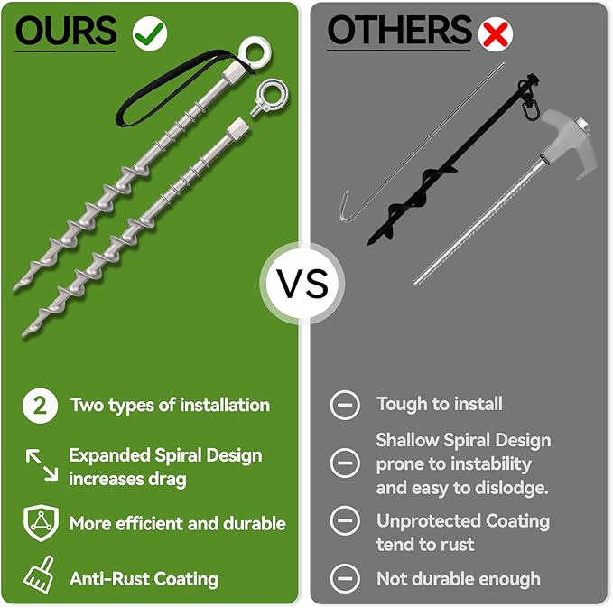 - LIGHTWEIGHT & SAFE: Each lightweight 14 inch spiral anchor stake ensures secure anchoring as ground anchors for sand or duty camping stakes, safe for women and men in all outdoor conditions