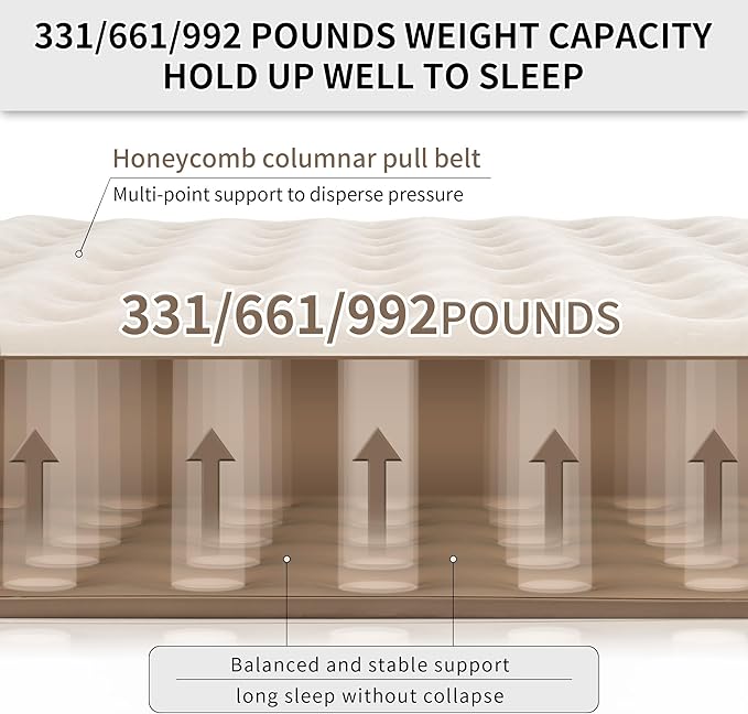 - HONEYCOMB LOAD BEARING SYSTEM - mimics the stable and sturdy structure of a honeycomb. The center of the mattress is filled with a composite column of high elasticity tension bands that provide softness and flexibility while dispersing pressure at multiple points of support. The mattress has a weight capacity of 661 pounds, allowing you to experience the comfort of being supported by clouds