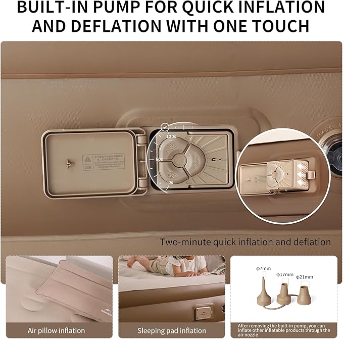 - PATENTED BUILT-IN PUMP - Free extractable built-in inflatable pump, 3-minute one-click inflate or deflate, free your hands, a cup of coffee time you can lie comfortably on the mattress. Comes with USB cable for charging, one full charge can be used 3-5 times, no need to charge frequently. This built-in pump is also suitable for other inflatable mattresses from Naturehike. Patented dual vent nozzle, first layer inflates without leakage, second layer deflates quickly