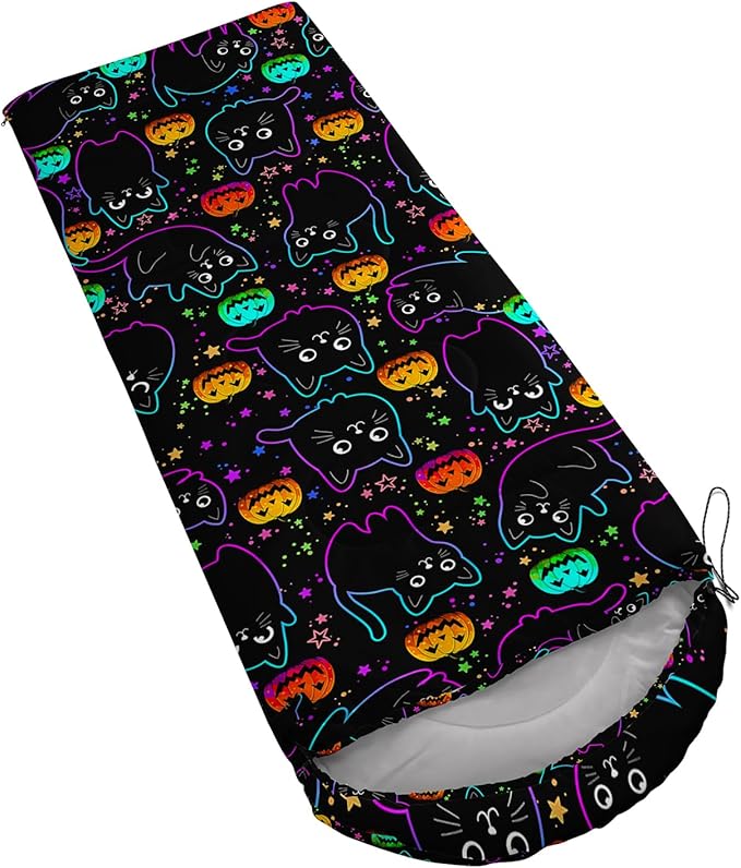 - 【Fashion Design】Various patterens on this black sleeping bag including cats,pumpkins and stars.This cat sleeping bag outdoor is lightweight and waterproof.Not only as camping essentials,but also as a gift,this hiking sleeping bag is a great choice.
