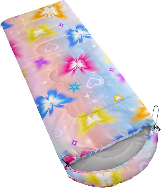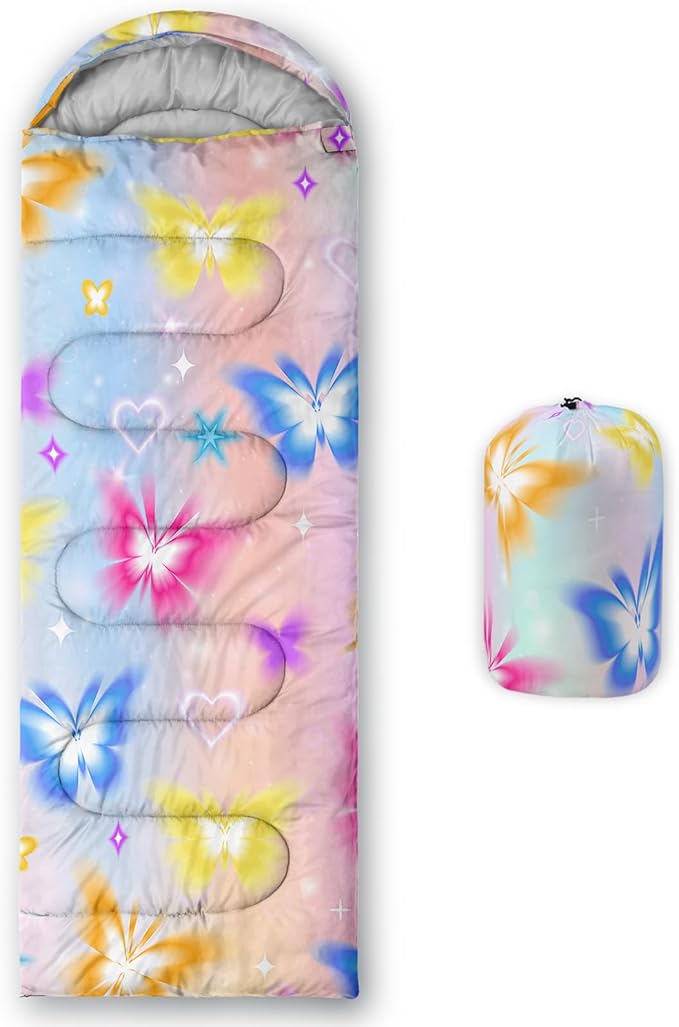 - 【Fashion Design】This animal-themed hiking sleeping bag is designed with colorful butterfly pattern.Different star patterns add more color to it.As camping essentials,this sleeping bag is a great choice,also you can give it as a gift to your family and friends.