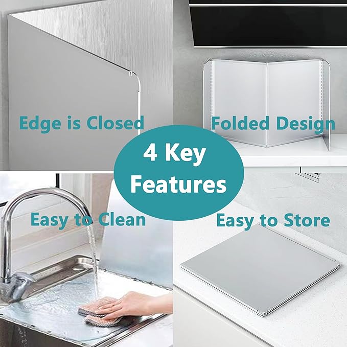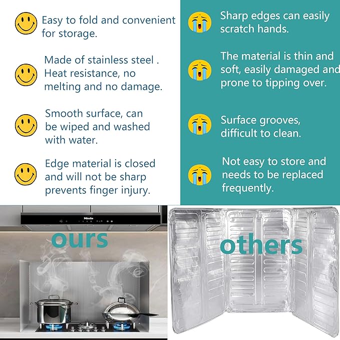 - Stainless Steel Grease splatter guard can effectively prevent most stoves and their surroundings from oil when cooking in the kitchen. Stainless steel backsplash blocks kitchen oil spatter effectively, eliminating the mess of splattered food.