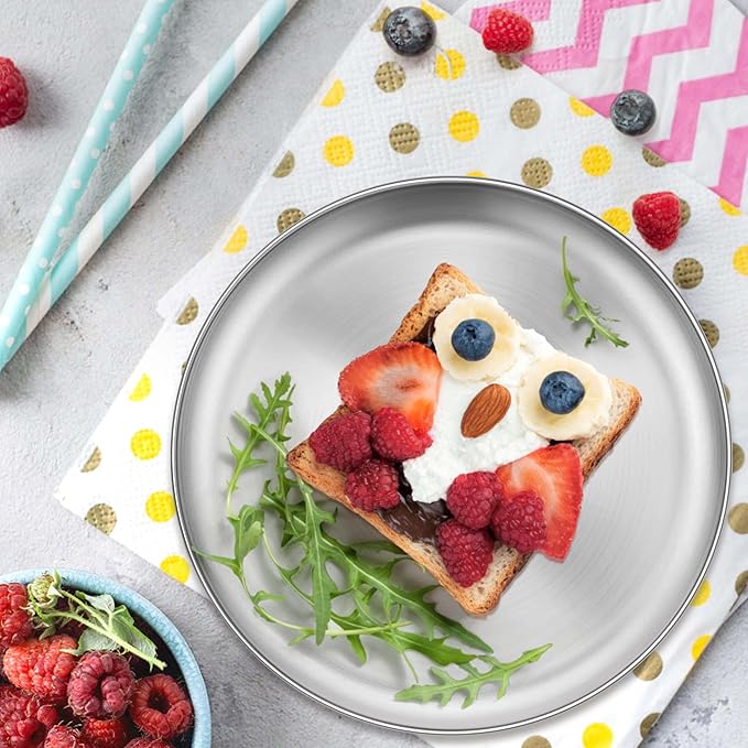 - Decent Quality, 8 pieces nontoxic metal round kids plates set is made of 304(18/8) stainless steel, without harmful substance, ensure the health of kids, toddler and adults, fancy dinner plates with excellent rust and corrosion resistance for strong durability, reusable plates dishes set for 8 to serve you well for a long time
