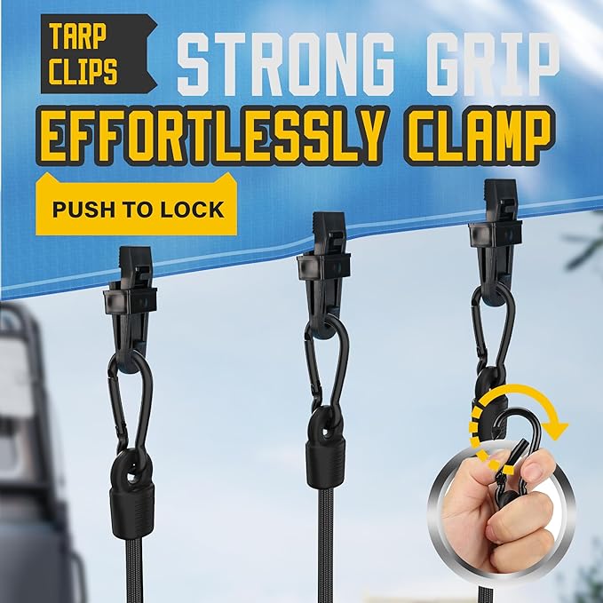 - Ball Bungee and Tarp Clips Included: The set includes 4 ball bungee cords (6") for securing tarps or canopies and 4 heavy-duty tarp clips that grip tightly to hold your setup in place.