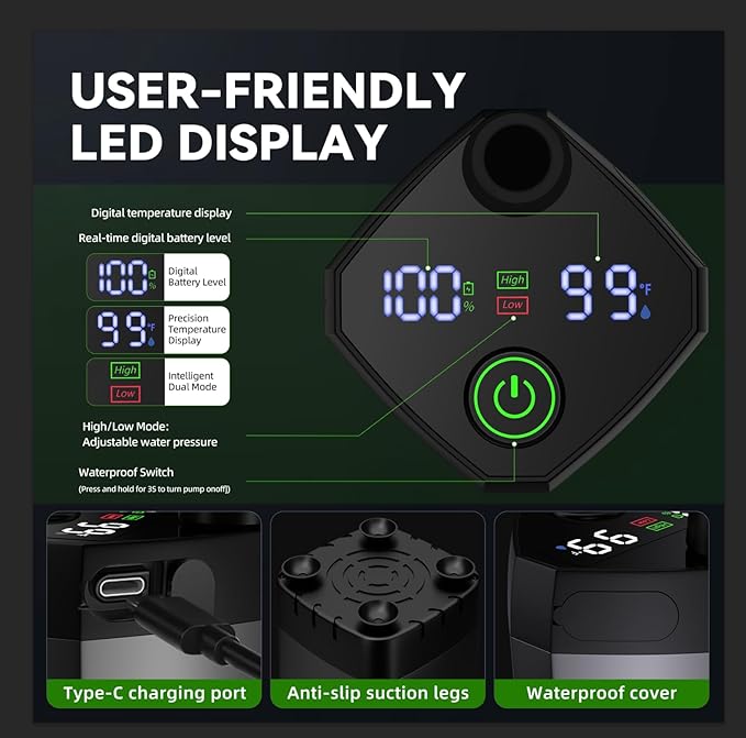 - Smart LED with Temperature Display: InkTrail camping shower kit also features an upgraded smart LED display that shows the current battery life, the running mode (high/low mode) as well as the water temperature in Fahrenheit. No more guessing the temperature and prevents scalding from hot water with our camping shower