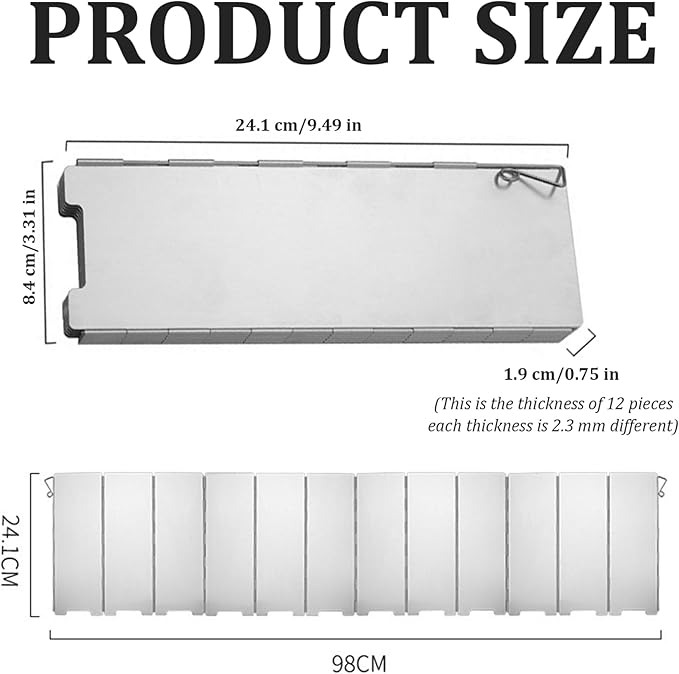 - Removable Windscreen: The windscreen for camping stove are consisted of 12 pieces of removable plates. You can remove or fold it into different sizes to install around different sizes of stoves