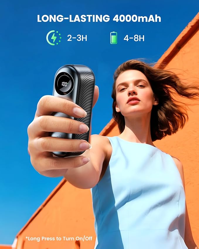 - Long-Lasting and Fast Charging: Powered by a 4,000mAh battery, this fan delivers 4-8 hours of continuous cooling (runtime varies by speed setting) and fully recharges in just 2-3 hours via USB-C. Ideal for travel, picnics, or daily commutes—say goodbye to frequent charging!