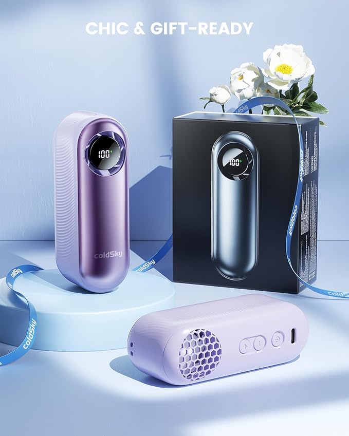 - Ultra-Portable Mini Fan: The coldSky portable fan fits comfortably in your palm and weighs just 5.8oz—light enough to toss in your bag or pocket for instant relief whether you're traveling, shopping, or out for the day. Plus, the included lanyard allows for convenient hands-free use.