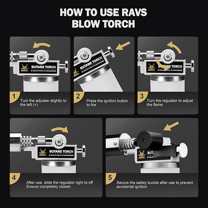 - [ Great Gift ] The ravs butane torch lighter is a good gift for men and women, parents, and friends. The kitchen torch lighter for creme brulee comes with a gift box. The brulee torch is great for men's gifts, husband gifts, and gifts for boyfriend. Unique dad gifts for men, house warming gifts new home, mens gifts.
