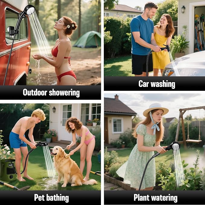 - 🏕️VERSATILE OUTDOOR COMPANION | Use with your portable shower tent for privacy in showers or pet baths. This camping shower adapts to beach fun, boat washing, and more. The IPX7 waterproof and USB Type-C charging make it a durable travel essential.