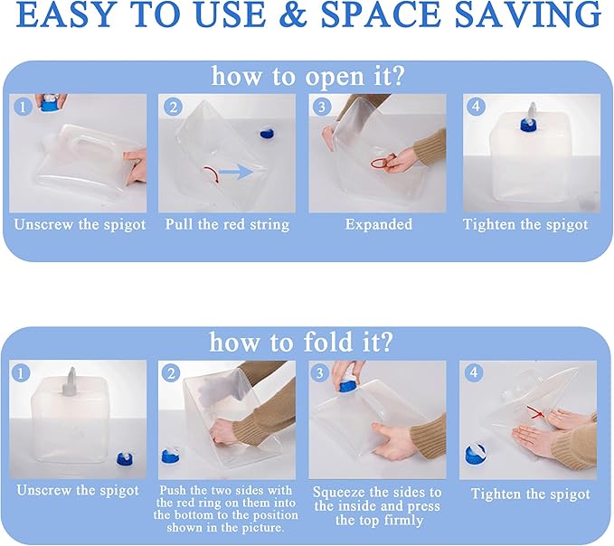 - 【Convenient Faucet & Leakproof Seal】: Our Collapsible Water Container comes with a one-button switch food-grade faucet for precise control of water flow, with a double-layer silicone seal, pouring water without leakage, meeting the needs of outdoor drinking water, washing, pet feeding and other multi-scenarios.