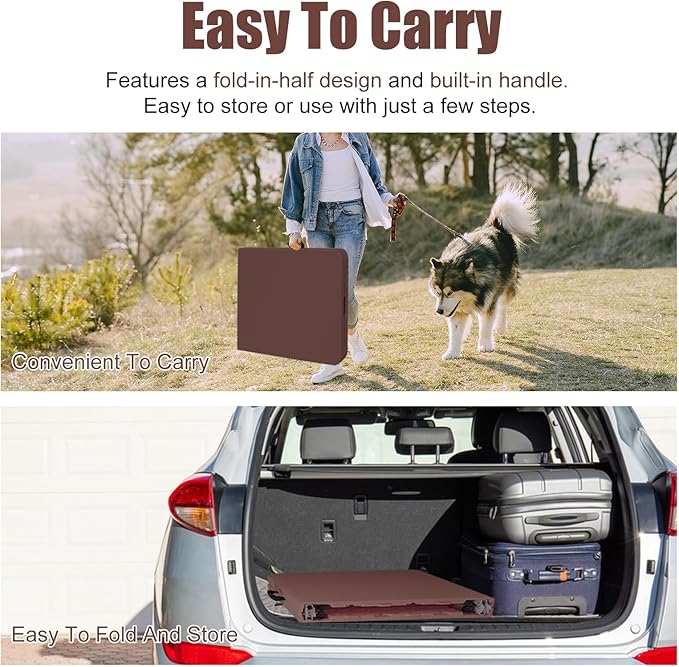 4 FT Folding Table with Carry Handle, Portable Fold-in-Half Plastic Table, Rectangle Foldable Table for Indoor/Outdoor Brown
