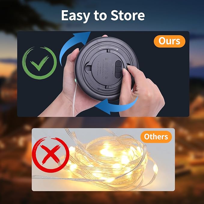 - Waterproof and Durable: With an IP44 waterproof rating, the camping string lights are suitable for various outdoor activities, even in wet environments. The LED light strips are made of copper wire and transparent PVC material, providing clear 360-degree lighting. Highly flexible and tangle-resistant, they can be easily bent. 10 meters long battery string lights is the best choice for decorating your tent