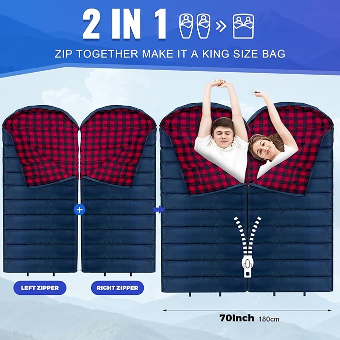 - Features: Two single sleeping bags(left and right)can be zipped together seamlessly to create a spacious double sleeping bag, while also fully opening into a wide, comfortable mat—perfect for versatile outdoor adventures, cozy couple camping, or flexible sleeping arrangements.