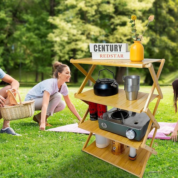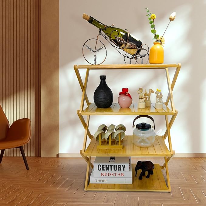 Foldable Bamboo Shelf, Folding Shoe Rack, Flower Rack, Camping Rack, No Installation Required, Portable, Space Saving, Multi-Purpose Storage Rack (Natural, 4 Tiers)