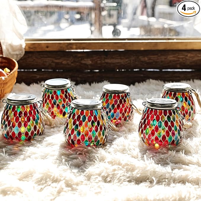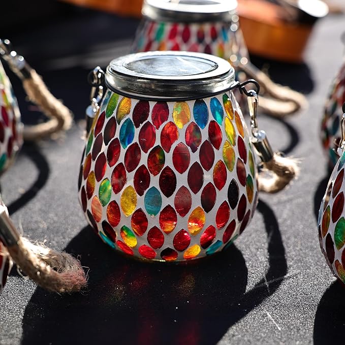 Cooo 4 Pack Mosaic Solar Lantern Outdoor Waterproof IP68 Hanging Projection Light Hidden Lid Pear-Shaped Lantern with Rope Handle Solar Powered Auto On for Patio Garden Fence Table - Crimson Ember