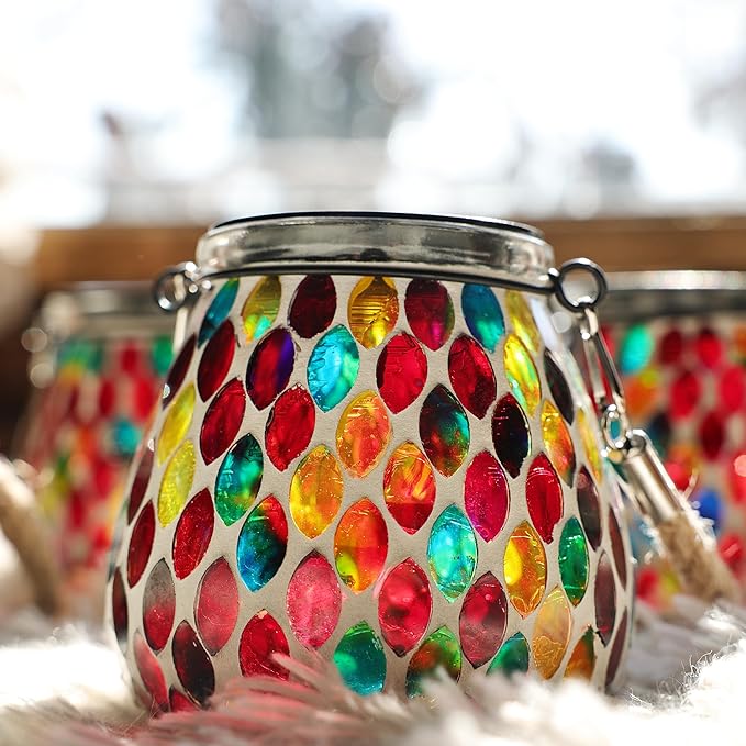 - 《Ruby Mosaic That Glows with Personality》Hand-placed oval mosaic glass tiles in rich red tones wrap around the entire lantern, creating a dazzling play of color. In the daylight, the glass refracts sunbeams like stained glass; by night, Passionate light shines through the mosaic to cast a vibrant, romantic glow in your garden.