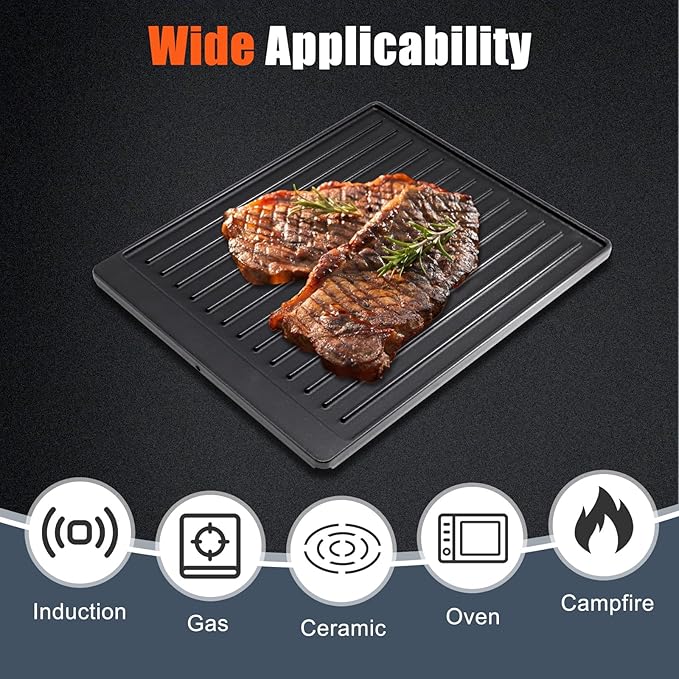 - 【Easy to Clean】➤This universal griddle has a smooth surface, preventing food from sticking together and makes cleanup a breeze.NOTE: Before using for the first time, the griddle for gas grill should be seasoned so that the surface does not stick.Spend less time scrubbing and more time tasting your cooking creations.