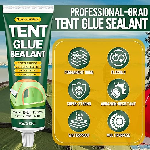 - PROFESSIONAL-GRADE STRENGTH: GleamGlee Flexible Repair Glue is a powerful, professional-grade adhesive designed specifically for tent repairs and surface sealing. Unlike regular glues, it’s both highly flexible and waterproof, making it perfect for fixing gaps, tears, and holes in a variety of materials such as nylon, vinyl, and canvas. This glue forms a durable, long-lasting bond, ensuring your gear stays in top condition during camping trips and outdoor adventures.