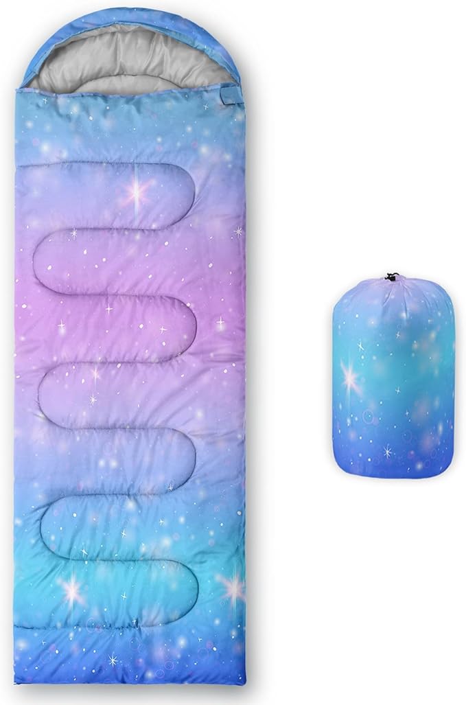 - SUITABLE:The sleeping bag can be used for 3 Seasons.SIZE:90.5"L x 31.5"W Suggenal extreme temperature: 41 ℉ -77 ℉.Applicable in a variety of scenarios,such as Travel camping pajamas party,It's very suitable for you to travel with your children.Half-circle hood with adjustable drawstring,which can keep you warm and prevent your humidity