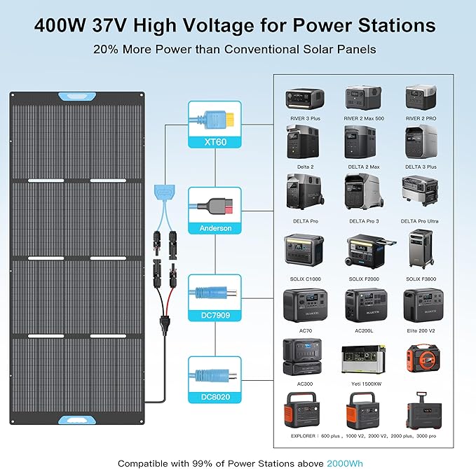 - 【Waterproof & Durable】The portable 400W solar panel utilizes advanced ETFE lamination technology, providing the solar module with IP67-rated waterproof protection. Additionally, its casing is made of waterproof Oxford fabric, The fiberglass structure offers outstanding durability, corrosion resistance, and thermal stability, ensuring long-lasting performance in outdoor activities.